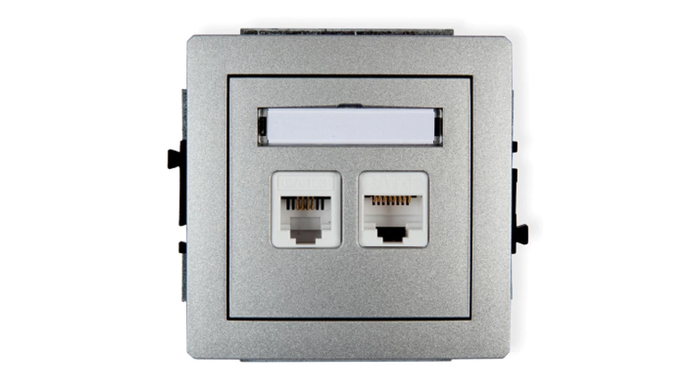DECO Gniazda telefoniczne pojedyncze 1xRJ11 + komputerowego pojedynczego 1xRJ45, kat. 5e, 8-stykowy, beznarzędziowe srebrny meta