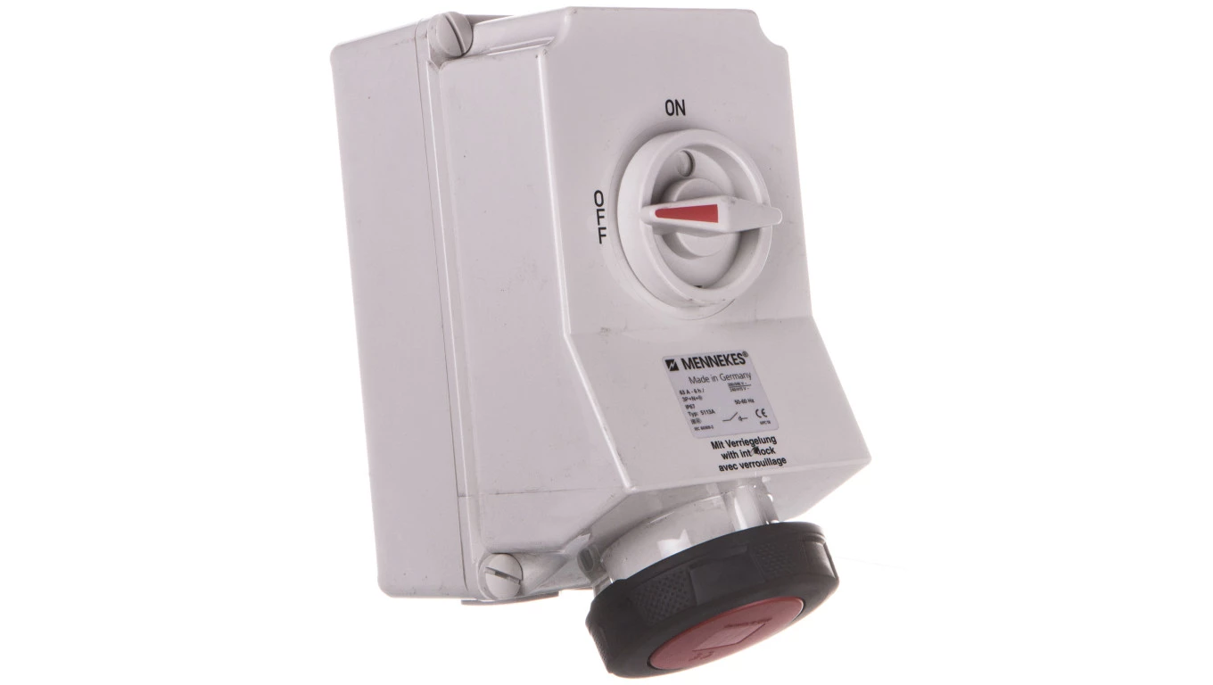 Gniazdo naścienne z rozłącznikiem 63A 5p 6h 400V IP67 z podwójną blokadą mechaniczną MEN5113A