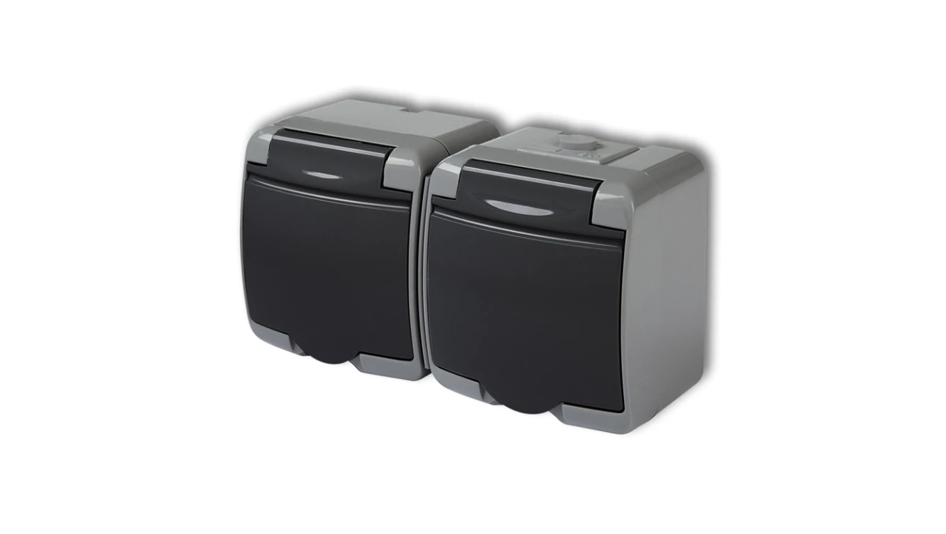 JUNIOR Gniazdo podwójne z/u (klapka dymna) popielaty IP54 10GHE-2d