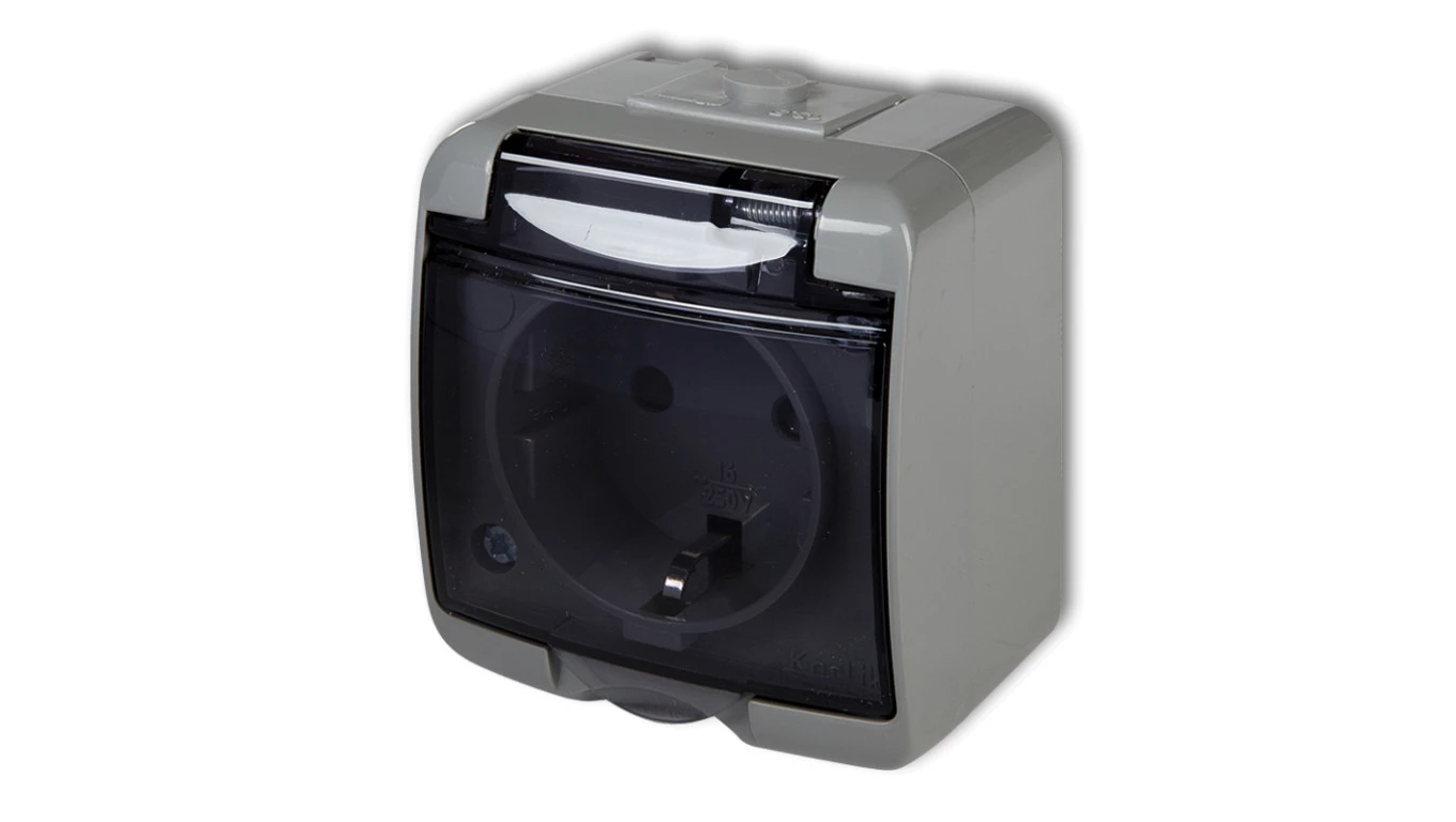 JUNIOR Gniazdo pojedyncze z/u (klapka dymna) popielaty IP54 10GHE-1d