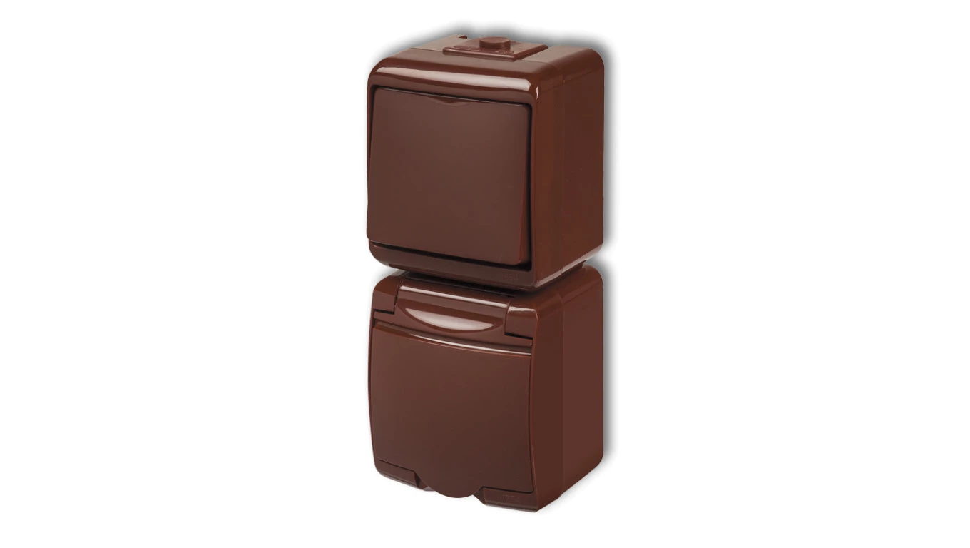 JUNIOR Łącznik jednobiegunowy + gniazdo hermetyczne (klapka brązowa) brązowy 4WGHP-1