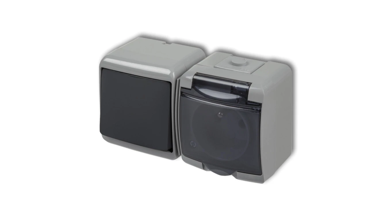 JUNIOR Łącznik jednobiegunowy z gniazdem hermetycznym (klapka dymna) popielaty / grafitowy 30WGHH-1dp