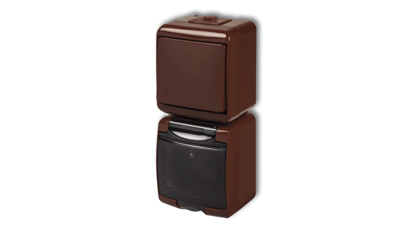 JUNIOR Łącznik schodowy + gniazdo hermetyczne (klapka dymna) brązowy 4WGHP-3dp