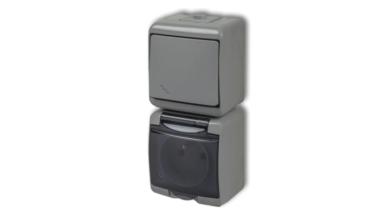 JUNIOR Łącznik schodowy + gniazdo hermetyczne (klapka dymna) popielaty 10WGHP-3dp