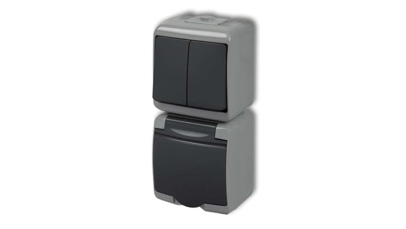 JUNIOR Łącznik świecznikowy z gniazdem hermetycznym (klapka grafitowa) popielaty / grafitowy 30WGHP-2p