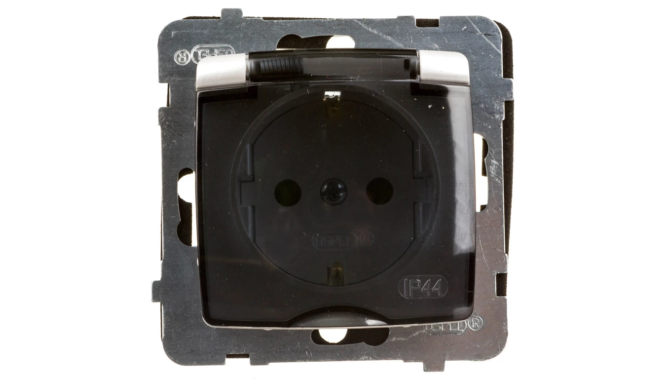 KARO Gniazdo bryzgoszczelne z/u Schuko IP44 z przesłonami klapka przezroczysta srebrny perłowy GPH-1SSP/m/43/d