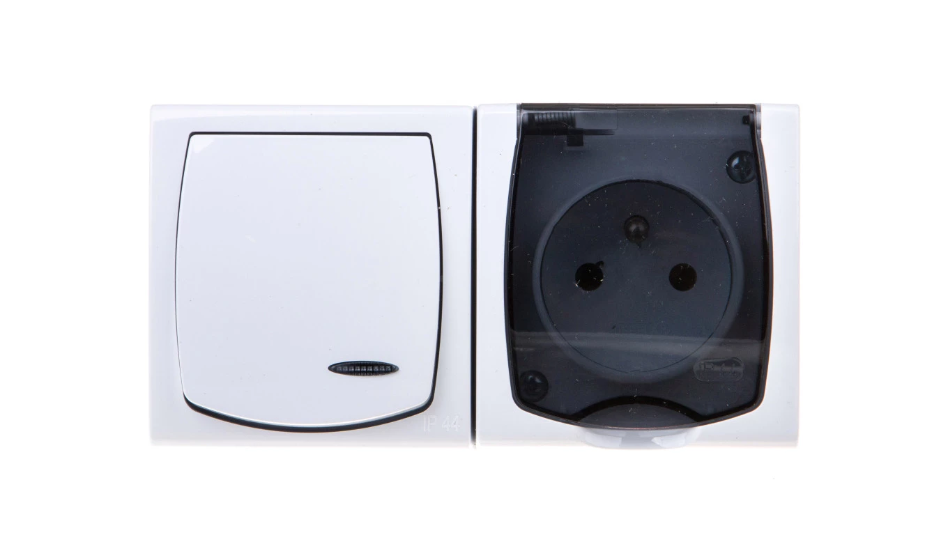 MADERA Łącznik hermetyczny pojedynczy z podświetleniem + gniazdo pojedyncze z/u z klapką przezroczystą biały ZH-NŁ1SG/00/d