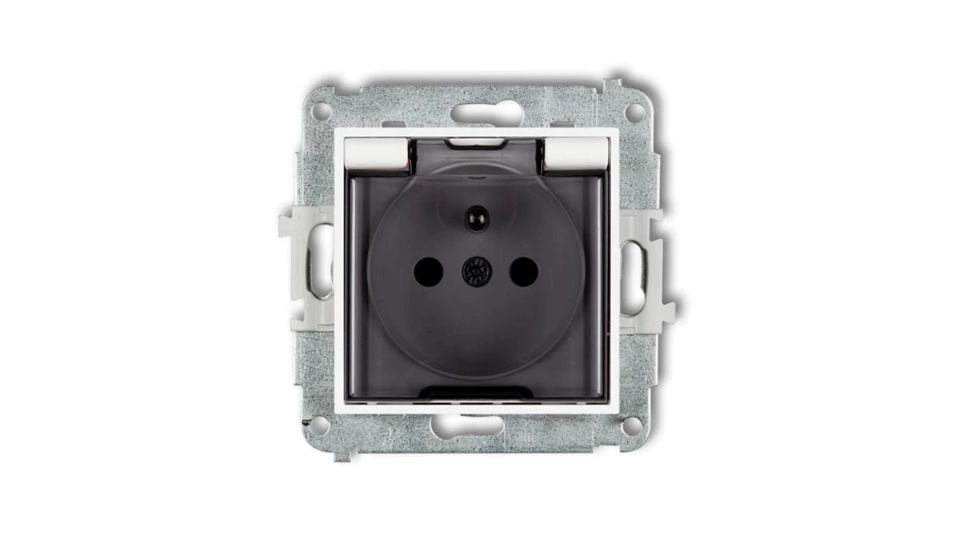 MINI Mechanizm gniazda bryzgoszczelnego z uziemieniem 2P+Z (klapka dymna, przesłony torów prądowych) biały mat 25MGPB-1zdp