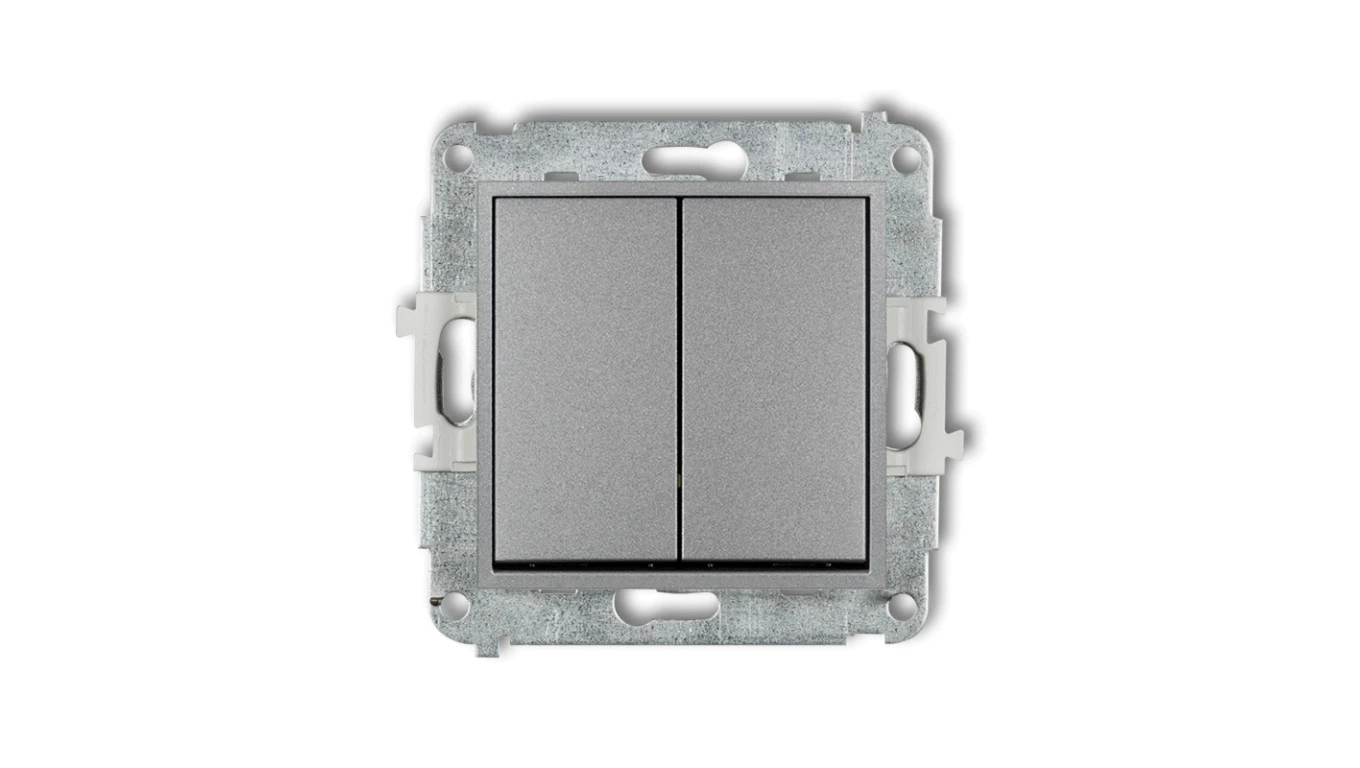 MINI Mechanizm łącznika jednobiegunowego ze schodowym (dwa klawisze bez piktogramów, wspólne zasilanie) srebrny metalik 7MWP-10.