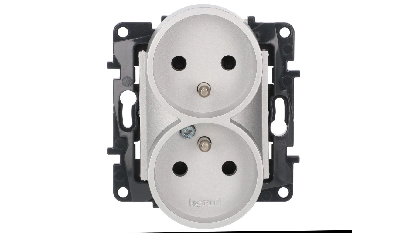Niloe Step Gniazdo zasilające podwójne 2x2P+Z do ramek wielokrotnych, zaciski śrubowe, z przesłoną styków aluminium 863334