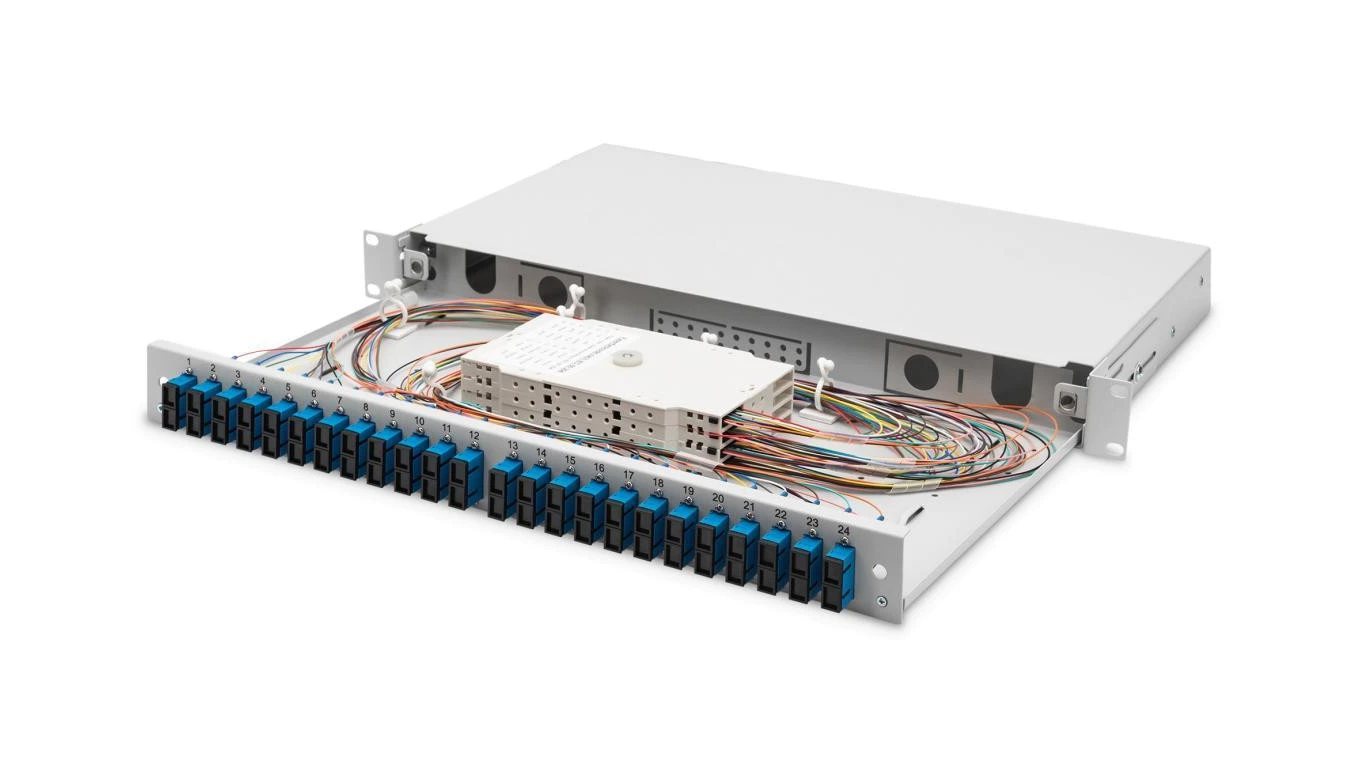 Panel krosowy FO z wyposażeniem 19 1U, 24x SC dx, OM3, adaptery, wysuwany, szary DN-96422/3