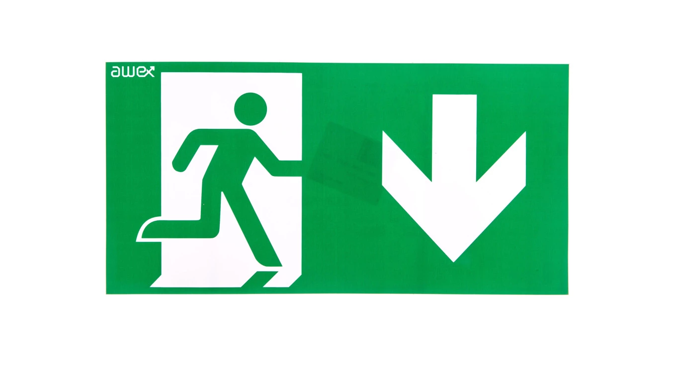 Piktogram PD27 150x300 strzałka w dół z prawej strony, człowiek w drzwiach logo awex (ISO7010)