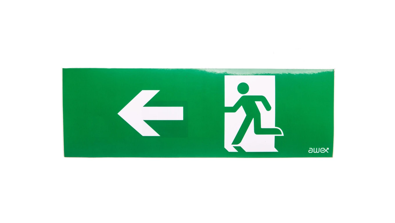 Piktogram PM24 100x300 strzałka lewo człowiek w drzwiach logo awex (ISO7010)