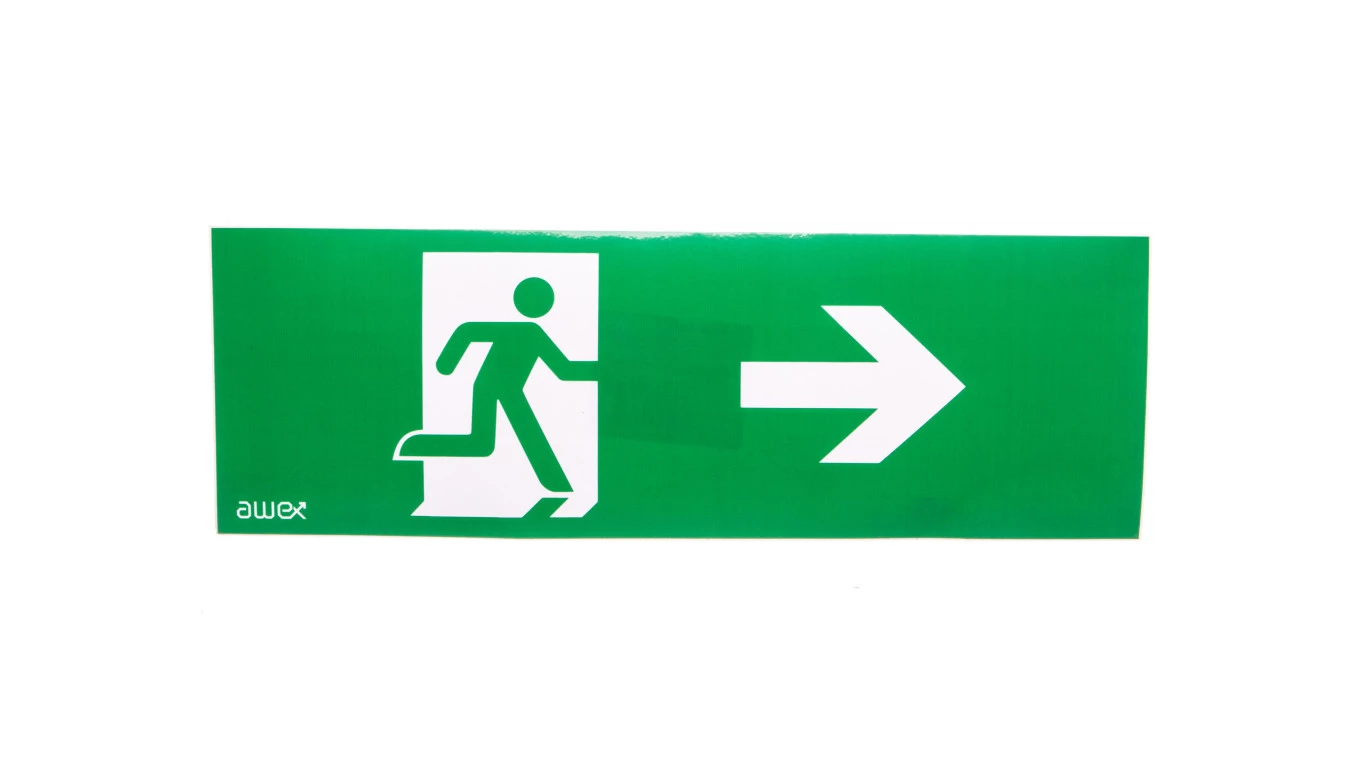 Piktogram PM24 100x300 strzałka lewo człowiek w drzwiach logo awex (ISO7010)
