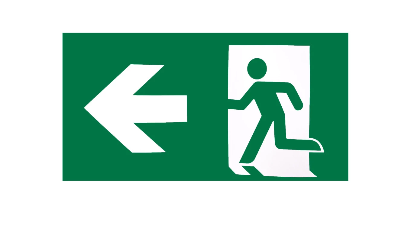 Piktogram PD24 140x300 strzałka w lewo człowiek w drzwiach logo awex (ISO7010)