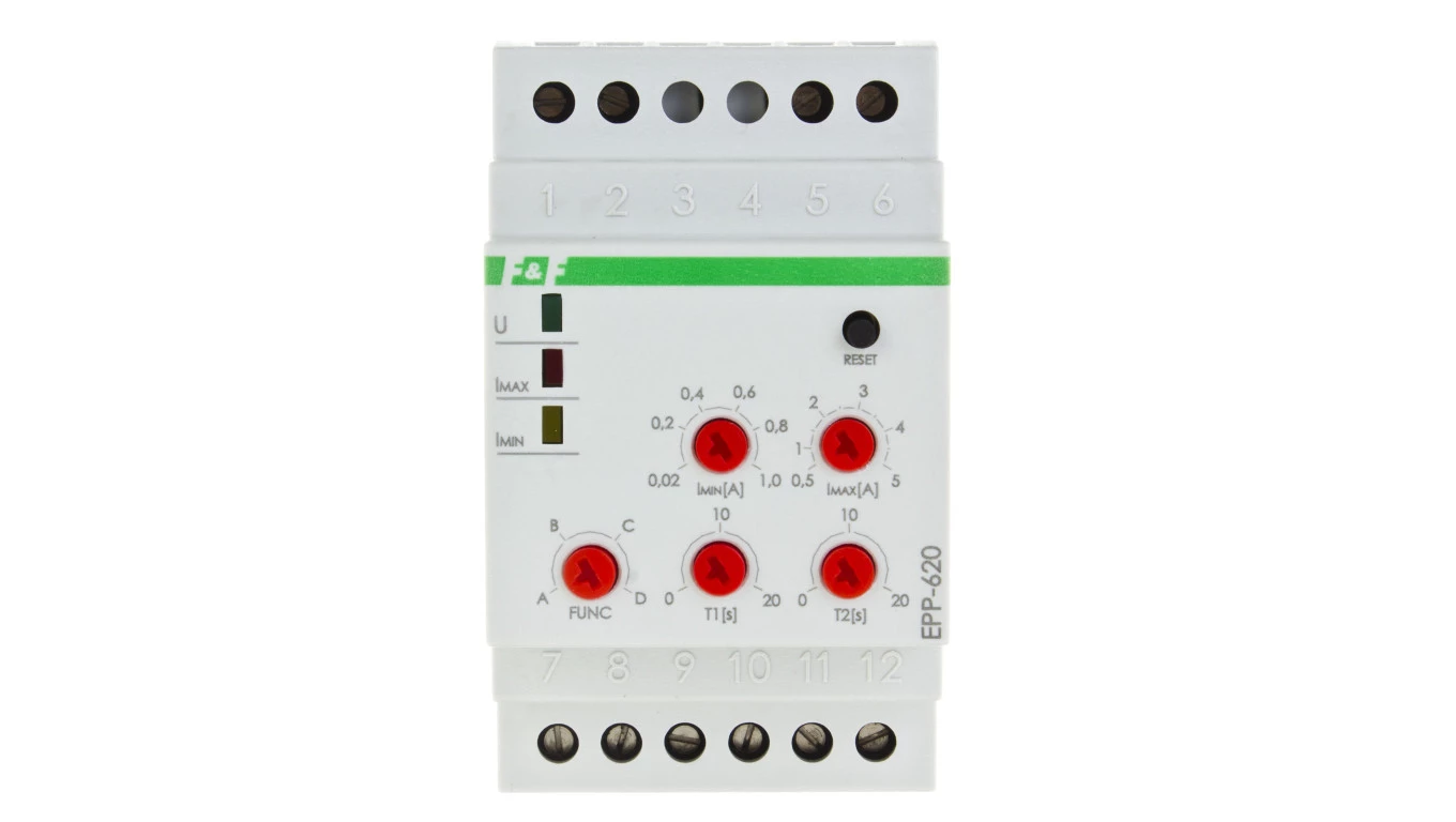 Przekaźnik kontroli prądu 4-funkcyjny 0,02-1/0,5-5A 2P 0-20sek (praca z przekładnikiem 5A) EPP-620