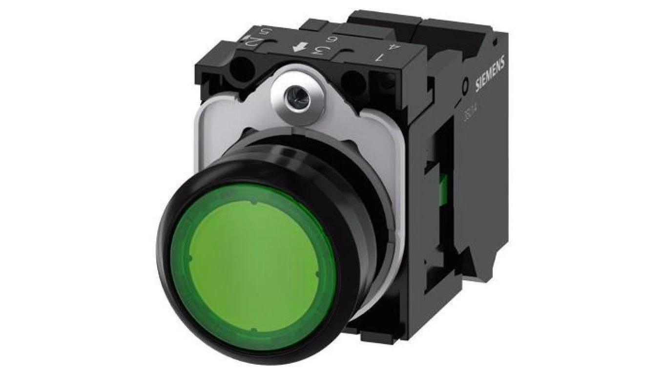 Przycisk okrągły podświetlany, 22 mm, plastik, zielony, przycisk, płaski, ze stykiem chwilowym, z uchwytem, 3SU1102-0AB40-3BA0
