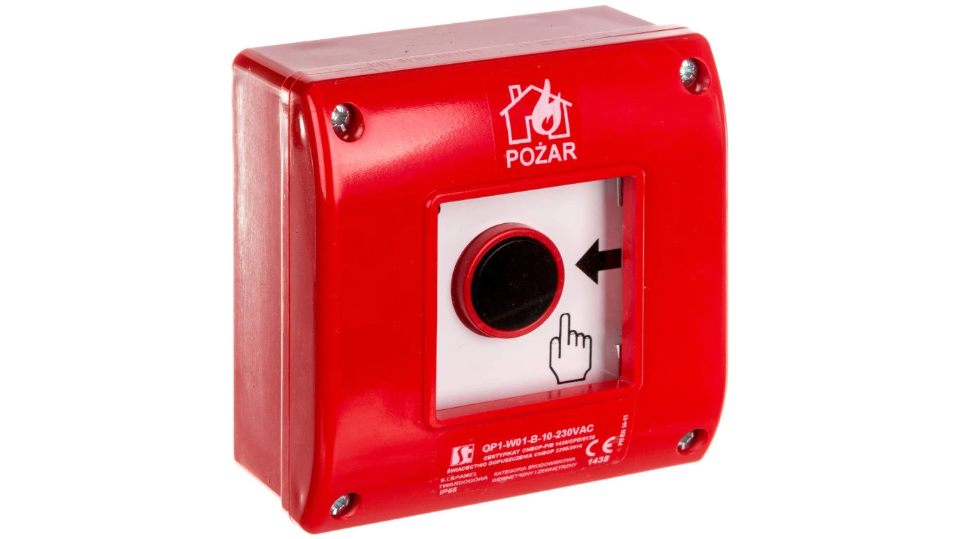Ręczny ostrzegacz przeciwpożarowy natynkowy, styk 1Z+LED 230V AC OP1-W01-B10-230