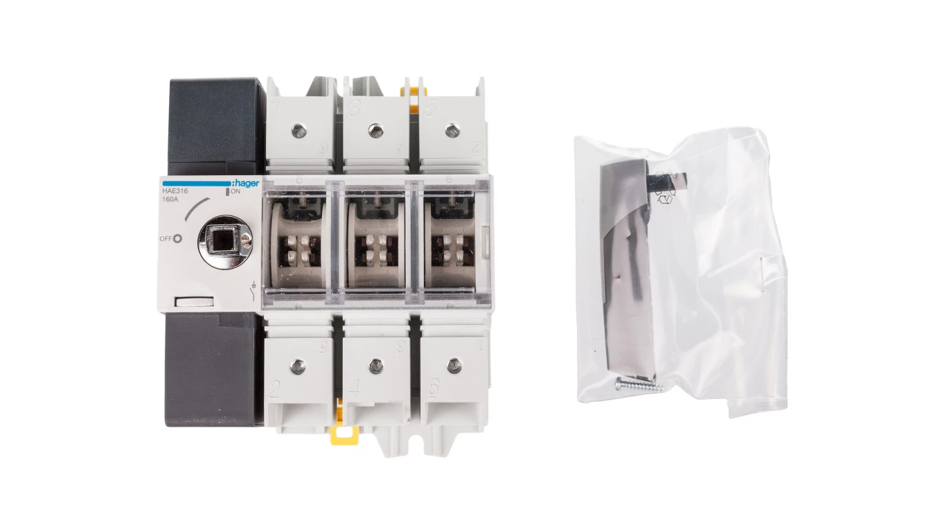 Rozłącznik izolacyjny 3P 160A z widoczną przewą HAE316