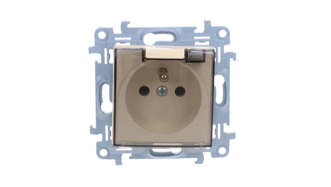 Simon 10 Gniazdo pojedyncze IP44 z uszczelką klapka w kolorze transparentnym kremowy 16A, szybkozłącza, CGZ1BC.01/41A