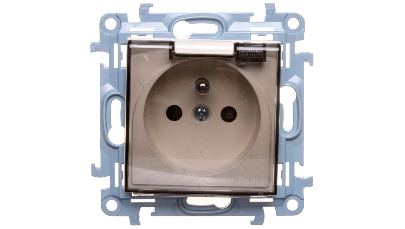 Simon 10 Gniazdo pojedyncze z uszczelką z przesłonami klapką transparetną kremowe 16A 250V IP44 CGZ1BZ.01/41A