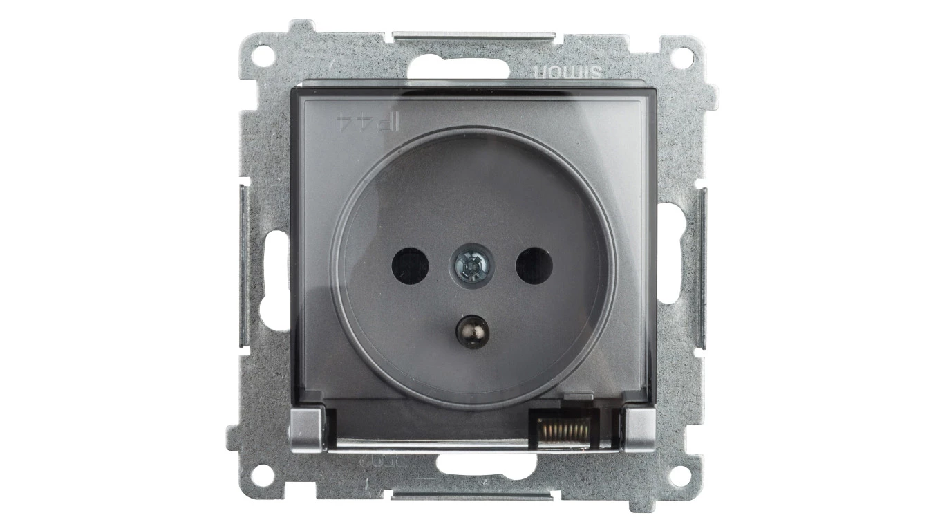 Simon 54 Gniazdo bryzgoszczelne z/u IP44 z klapką transparentną bez uszczelki srebrny mat DGZ1BUZ.01/43A