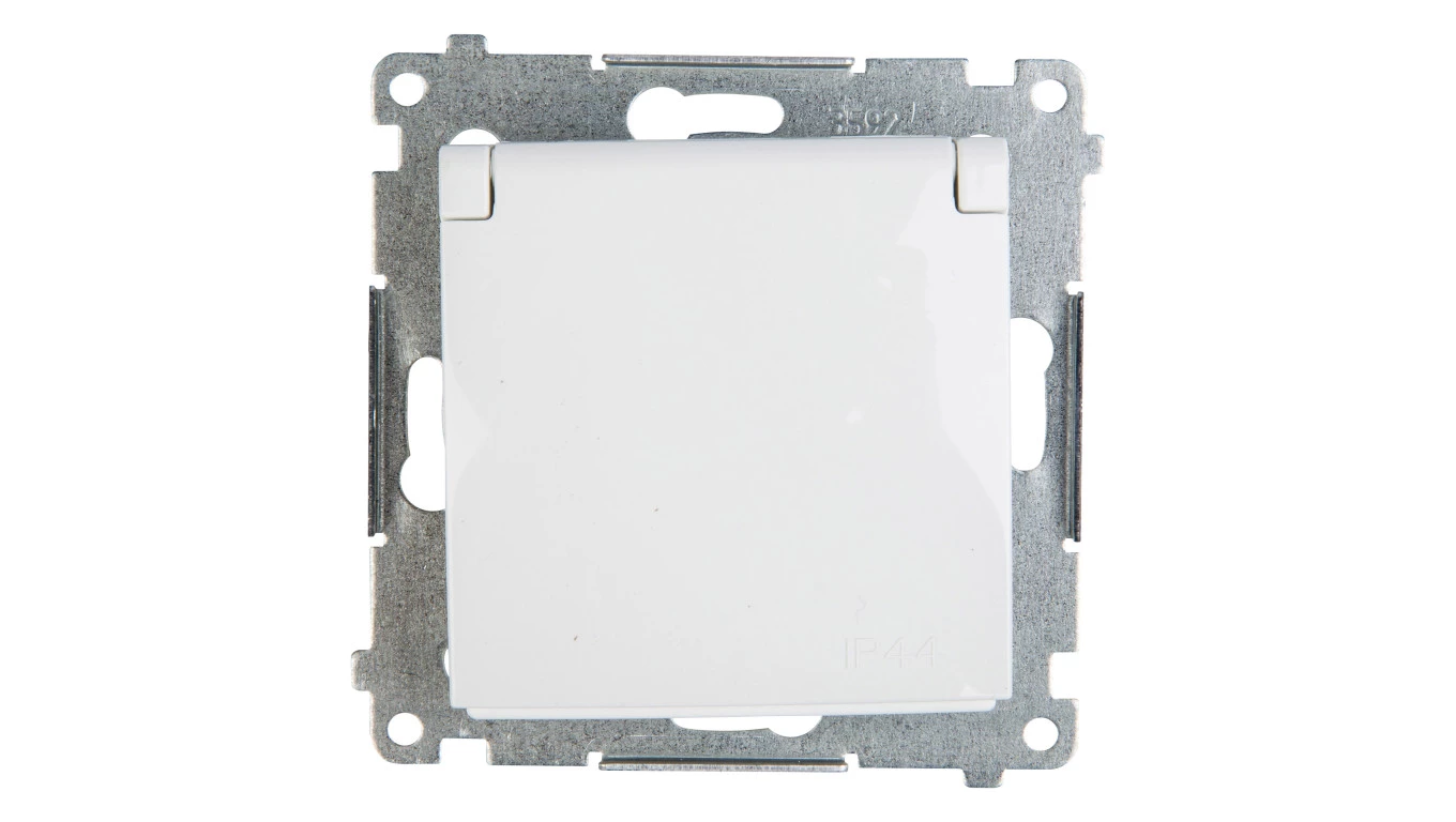 Simon 54 Gniazdo pojedyncze z/u 16A IP44 z przesłoną torów z klapką białe DGZ1BUZ.01/11