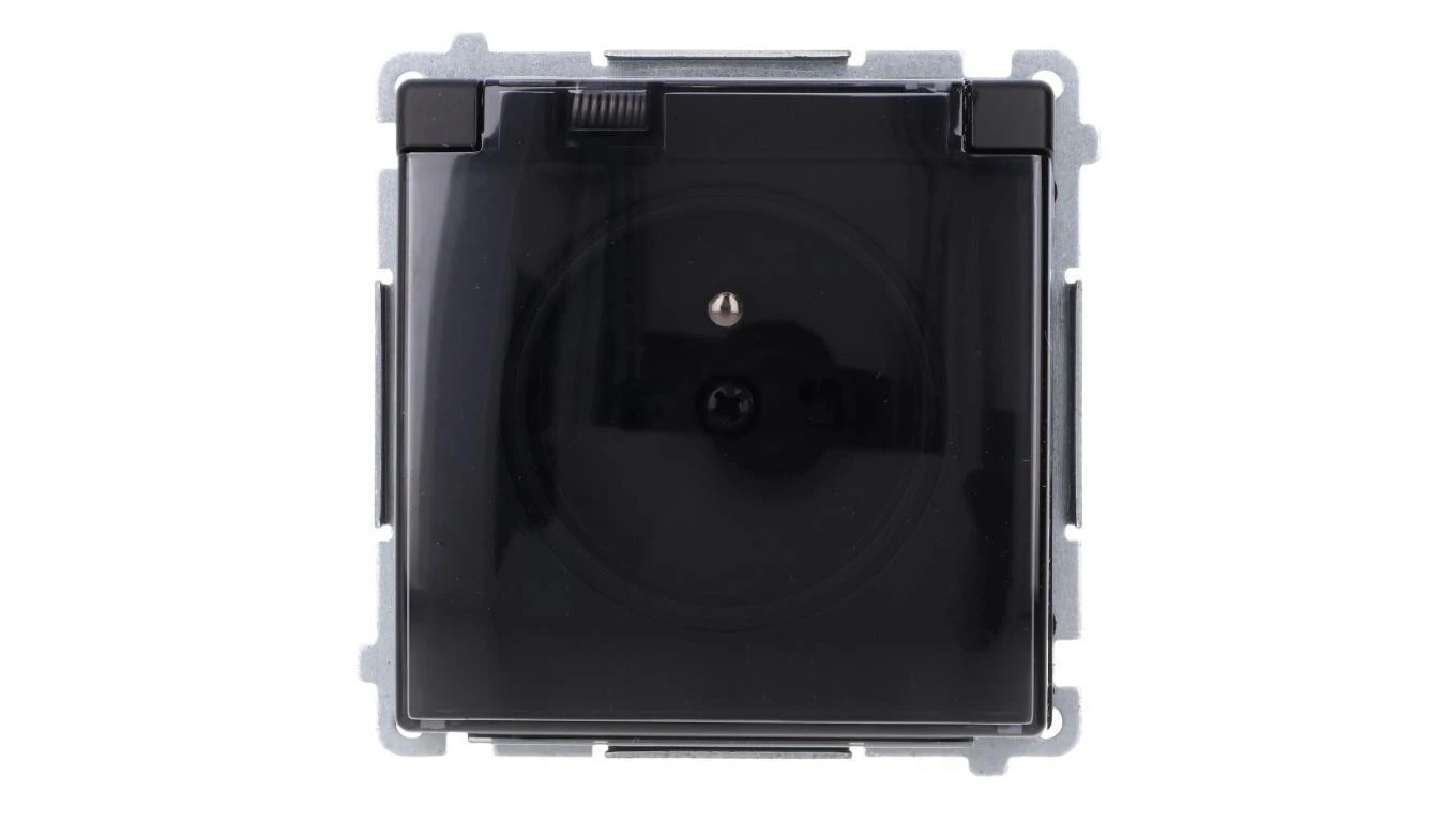Simon Basic Gniazdo wtyczkowe z uziem., z przesł. torów prąd, IP44 (moduł) zaciski śrubowe klapka transp. czarny BMGZ1BZ.01/49A